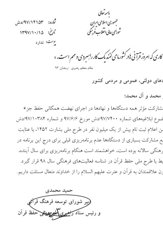 اخیراً شورای توسعه فرهنگ قرآنی (بالاترین نهاد تصمیمگیر قرآنی) طی نامهای به نهادهای فرهنگی اعلام کرده که طرح بشارت 1452 برای جذب حداکثری مخاطبان تا سال 98 نیز تمدید خواهد شد.