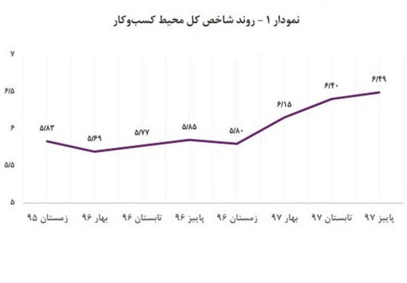 نتایج پایش ملی محیط کسب و کار ایران در پاییز 1397، رقم 6.49 (نمره بدترین ارزیابی 10 است) را به عنوان شاخص ملی به دست می دهد که بدتر از وضعیت این شاخص نسبت به ارزیابی فصل گذشته (تابستان 1397 با میانگین 6.40) بوده است. همچنین این ارزیابی بیانگر آن است که از نظر فعالان اقتصادی مشارکت کننده در این پایش، در اکثر استانها وضعیت بیشتر مؤلفههای مؤثر بر محیط کسب وکار ایران در پاییز 1397، تا حدودی نامساعدتر شده است.