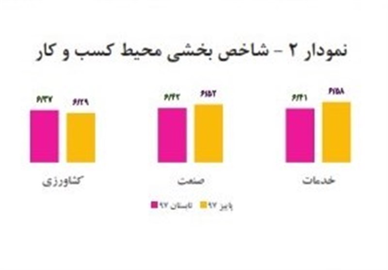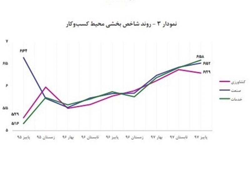 بر اساس نتایج این پایش در پاییز 1397، وضعیت محیط کسب و کار در بخش خدمات در مقایسه با بخشهای کشاورزی و صنعت نامناسبتر ارزیابی شده است و در بین رشته فعالیتهای اقتصادی نیز، رشته فعالیتهای 1- اداری و خدمات پشتیبانی، 2- سلامت انسان و مددکاری اجتماعی و 3- عمدهفروشی و خردهفروشی، تعمیر وسایل و غیره (صادرات و واردات)، به ترتیب دارای بدترین وضعیت کسب و کار و رشته فعالیتهای 1- مالی و بیمه، 2- هنر، سرگرمی و تفریح و 3- آموزش، به ترتیب بهترین وضعیت کسب و کار را در مقایسه با سایر رشته فعالیتهای اقتصادی در کشور داشتهاند.