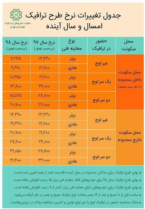 به گزارش خبرنگار اجتماعی خبرگزاری تسنیم، طرح ترافیک 98 در حالی قرار است از سال آینده توسط شهرداری تهران اجرا شود که بر اساس اعلام معاونت حملونقل و ترافیک شهرداری تهران قرار است نرخ ورود به طرح ترافیک بر اساس نرخ تورم و حداکثر 15 درصد افزایش خواهد یافت.