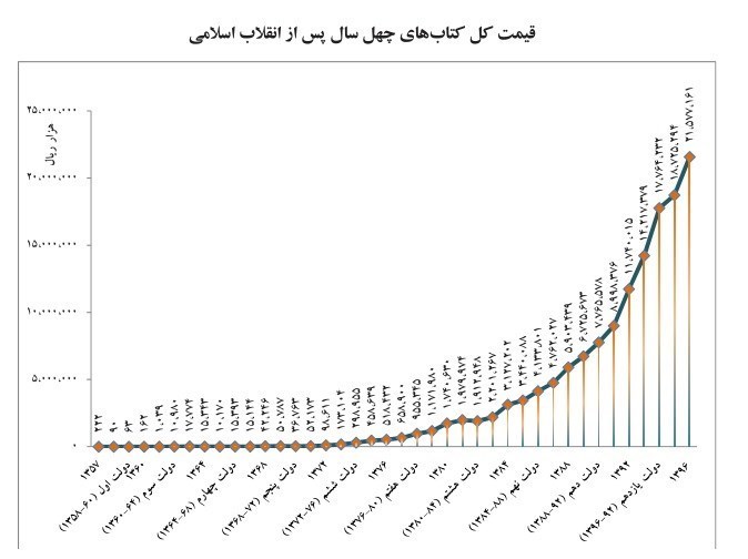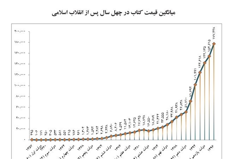 بعد از هشت سال جنگ تحمیلی، با توجه به تورم و افزایش نسبی قیمت کاغذ، قیمت کل کتاب نیز متناسب با افزایش تعداد عناوین با شیبی ملایم افزایش یافته؛ اما در نیمه دهه 80 این روند صعودی با جهش شدیدی همراه بود که در دهه 90 بهدلیل مهار تورم، از افزایش شتابان آن جلوگیری شده است.