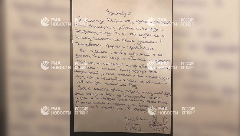 در بخشی از نامه الکساندر کوکورین آمده است: میخواهم از هوادارانم، بازیکنان و کادر فنی تیم زنیت سنپترزبورگ عذرخواهی کنم که نمیتوانم در تمرینها حضور داشته باشم و به آنها در رقابتها کمک کنم. به عنوان یک ورزشکار و انسان عادی نباید مرتکب آن اقدام میشدم و عذرخواهی میکنم که نتوانستم برابر خشم خود مقاومت کنم. از این حادثه درس گرفتم و زندان به من خیلی کمک کرد. خیلی دوست دارم آزادانه در ورزش حضور داشته باشم و به خانوادهام خدمت کنم. حمایتهای شما از من در زندان و آزادی بسیار مهم است.