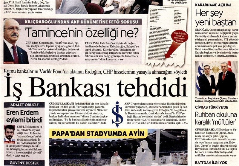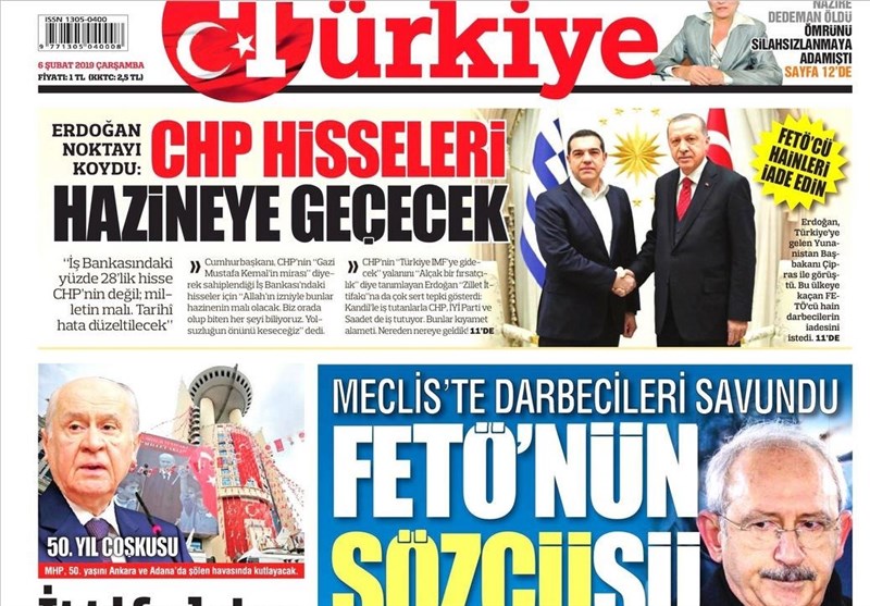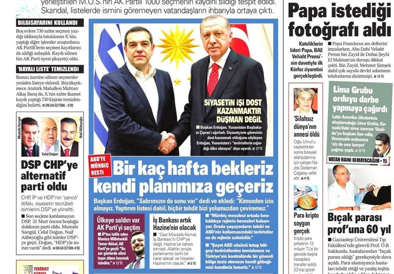به گزارش گروه بینالملل خبرگزاری تسنیم، بسیاری از روزنامههای ترکیه، امروز در عکس و تیتر صفحه نخست، دیدار اردوغان و چیپراس را برجسته کردهاند. همچنین این روزنامهها موضوعات دیگری مانند گرانی در بازار میوه و تره بار را مورد توجه قرار دادند.