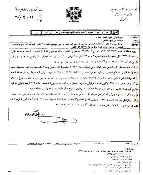 به گزارش خبرنگار اقتصادی خبرگزاری تسنیم، بخشنامه سازمان امور مالیاتی با موضوع افزایش سرمایه ناشی از تجدید ارزیابی داراییهای شرکتهای بورسی ابلاغ شد. بر این اساس شرکتهای مورد اشاره که بر اساس صورتهای مالی عملکرد سال 96 مشمول ماده 141 لایحه قانونی اصلاح قسمتی از قانون تجارت مصوب سال 47 شده باشند، در صورتی که در سال 97 اقدام به تجدید ارزیابی داراییهای خود نموده و مازاد حاصل از این تجدید ارزیابی را به حساب افزایش سرمایه منظور و فارغ از میزان درامد و هزینه طی سال 97 با این اقدام از شمول ماده 141 خارج شوند در این صورت امکان برخورداری از نرخ صفر مالیاتی را دارا خواهند بود.