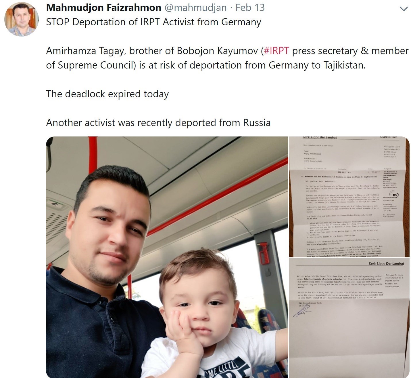مورد دیگری هم که در این زمینه مطرح شده است، پرونده برادر باباجان قیومزاد، سخنگوی حزب نهضت اسلامی و عضو شورای عالی این حزب است. در مورخ 13 فوریه محمودجان فیضالرحماناف، سخنگوی سابق حزب نهضت اسلامی در توئیتر خود خبر داد که مهلت وی به اتمام رسیده و احتمال دیپورت تاگای و حتی بازگرداندن وی به تاجیکستان وجود دارد. فیضالرحماناف همچنین خواستار توقف فرایند دیپورت تاگای شده است. برادر باباجان قیوماف از فعالین حزب نهضت اسلامی در اروپا بود که در آلمان به سر میبرد.