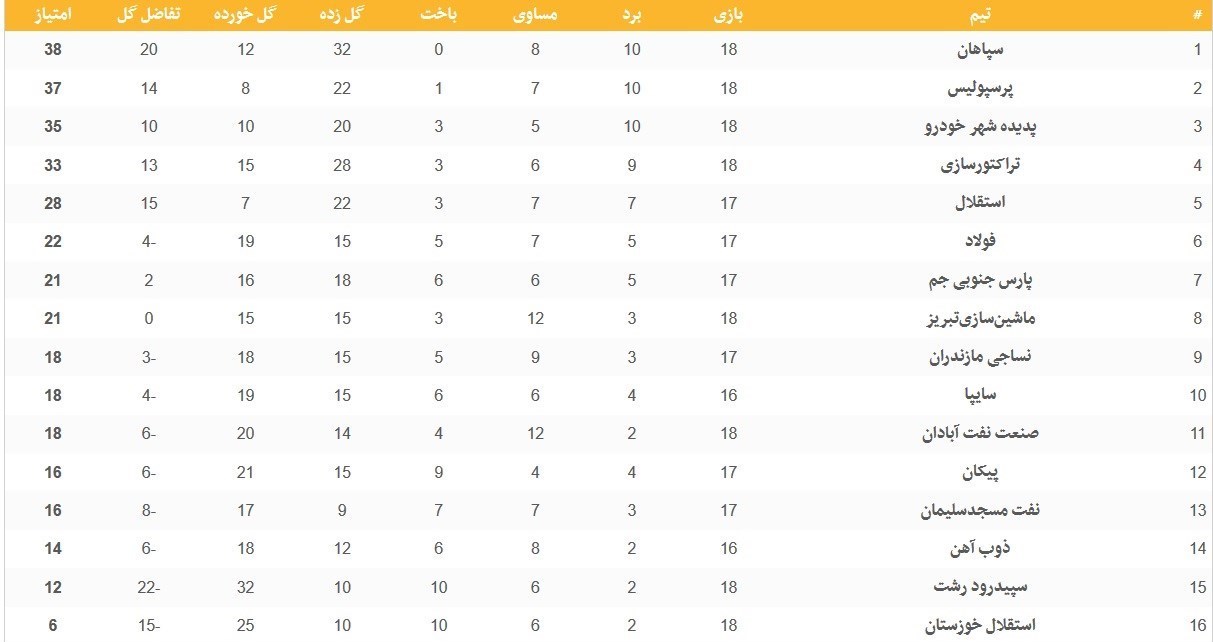 جدول ردهبندی لیگ برتر در پایان روز دوم از هفته هجدهم در زیر آمده است:
