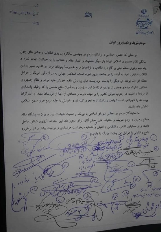 ما نمایندگان مردم در مجلس شورای اسلامی با تبریک و تسلیت شهادت این عزیزان به پیشگاه مقام معظم رهبری و مردم شریف و خانواده‌های معظم آنان، برای مجروحان این حادثه، آرزوی شفای عاجل داشته و از مسئولین نظامی و انتظامی و امنیتی و قوه قضائیه درخواست هوشیاری و مراقبت بیشتر و نیز برخورد قاطع و قانونی با عوامل این جنایت بزرگ را داریم.