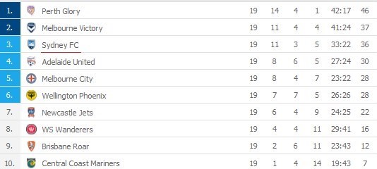 در جدول ردهبندی 10 تیمی ایلیگ استرالیا تیم افسی سیدنی با 36 امتیاز سوم است.