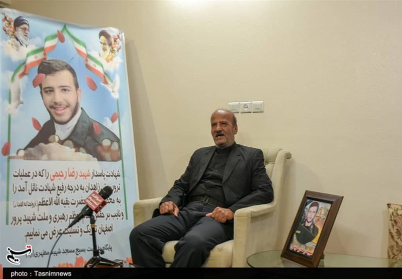 پدر شهید رحیمی: در زمان جنگ در کشور سوریه رضا دانشآموز بود اما پس از استخدام در سپاه همیشه بر این موضوع تاکید داشت که دفاع از ارزشهای انقلاب اسلامی حد و مرز جغرافیایی نداشته و اگر در کشور سوریه با دشمن مقابله نکنیم بایستی در کوچههای شهر با آنها بجنگیم.