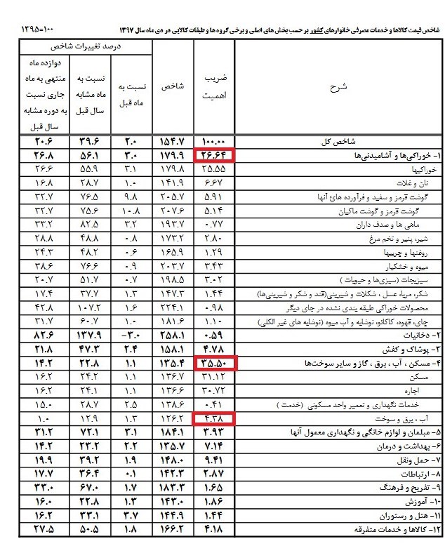 همانطور که در جدول زیر قابل مشاهده است، برای 12 گروه کالایی مختلف، که زیرمجموعههای آنها 475 قلم کالای موردنظر را تشکیل میدهند، در کنار ضریب اهمیت، به ترتیب تورمهای ماهانه، نقطهای و سالیانه درج شده است. در این جدول زیر اطلاعات زیرمجموعههای اصلی گروه خوراکیها یعنی نان، انواع گوشت، انواع لبنیات، سبزیجات، چای و... نیز قابل مشاهده است.