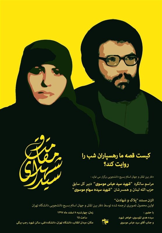 مسئول دفتر بین الملل و جهان اسلام بسیج دانشجویی دانشگاه تهران ادامه داد: در این زمینه مستندی که توسط شبکه الصراط لبنان تهیه و منتشر شده بود توسط دفتر جهان اسلام ترجمه و تدوین شده و طی مراسمی در روز چهارشنبه 97/12/8 ساعت 15 که با حضور خانواده شهید سید عباس موسوی در سالن شهید رجب بیگی دانشکده فنی دانشگاه تهران اکران خواهد شد. پساز اکران نیز ضمن سخنرانی و بیان خاطرات از خانواده ایشانتقدیر و تشکر به عمل خواهد آمد.
