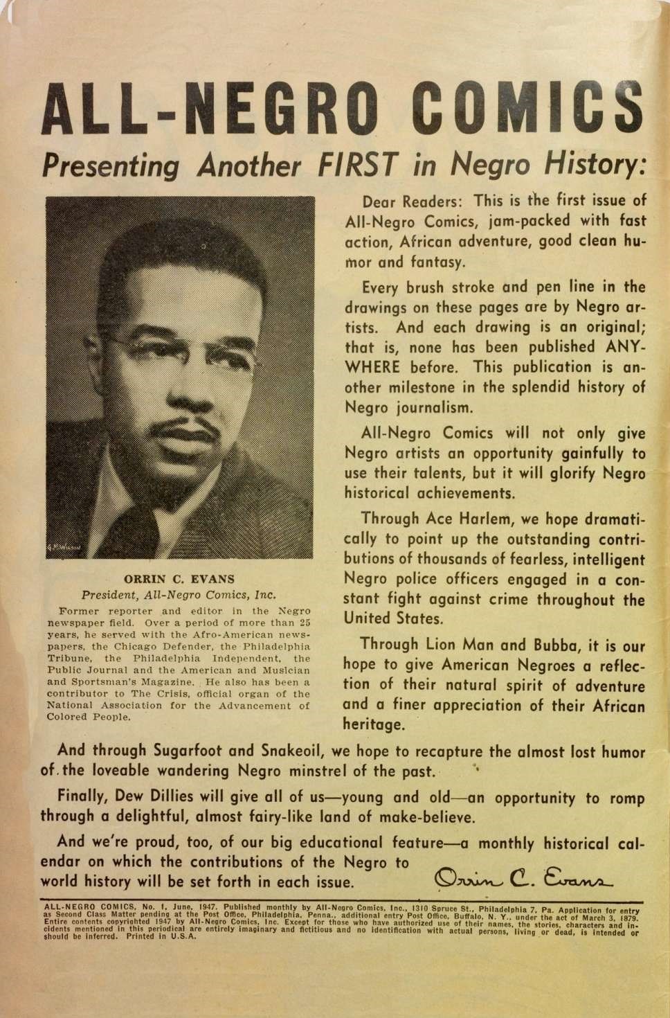 در سال 1947 ِاوانس مجله‌ای جدید با دیدگاهی کاملا متفاوت خلق کرد که ابرقهرمانش سیاه‌ پوست بود. این کتاب‌های مصور شخصیت‌های قدرتمندی مثل «مرد شیری» و «ایس هارلم» را چهره‌ای رنگین پوست به مردم معرفی می‌کرد. اولین شماره مجله کمیک این دو ابرقهرمان مورد استقبال قرار گرفت اما اِوانس نتوانست کارش را ادامه بدهد.