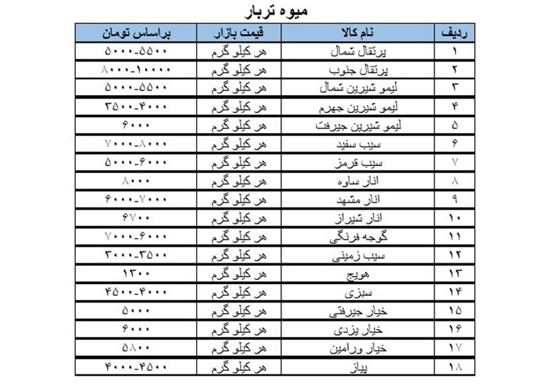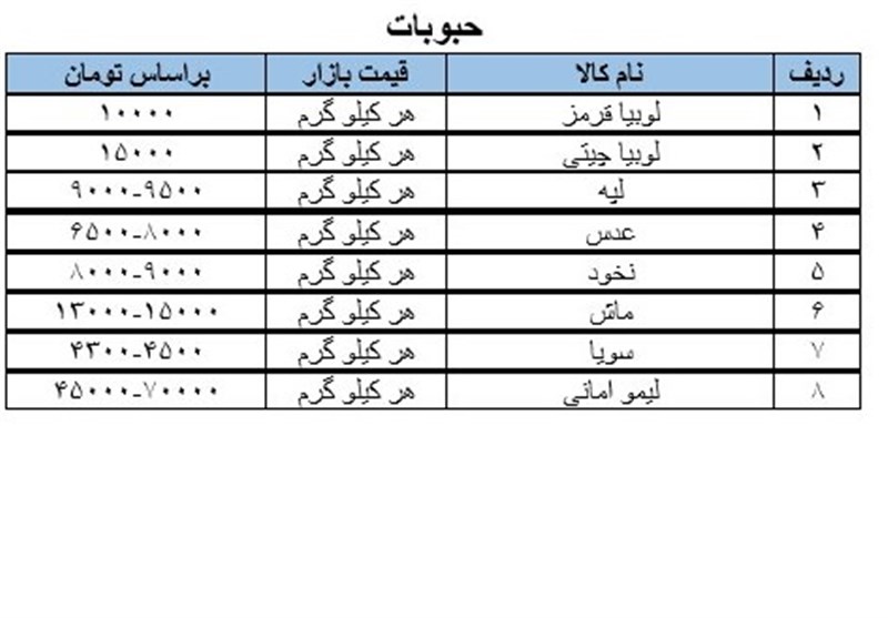 خبرگزاری تسنیم به صورت هفتگی قیمت میوه تربار، حبوبات، انواع مواد پروتئینی را در سطح بازار شهر ارومیه را منتشر می کند.