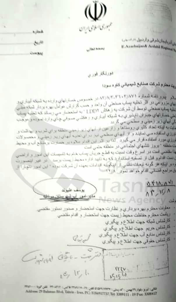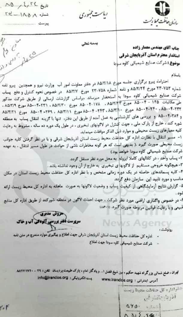 10) و اما سخن آخر اینکه بر اساس تصویر سند ذیل که اصل تصویر در دفتر خبرگزاری تسنیم آذربایجان شرقی موجود است، ادعای به دور از واقعیت مدیرکل حفاظت محیط زیست استان مبنی بر آلاینده نبودن و تحت کنترل بودن «کاوه سودا» را نه تنها روشن میکند، بلکه خطرناک بودن و خطرات بالقوه و احتمال تکرار فاجعه زیستی سال 89 را بار دیگر به مقامات مسئول استان گوشزد میکند.