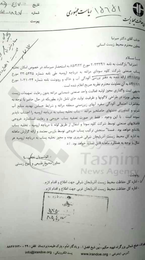 2) بر اساس ضوابط و معیارهای زیست محیطی واحد مذکور نمیتواند در محوطه کارخانه اقدام به احداث لاگون های تبخیری نماید. چرا که برابر اعلام نظریههای صریح معاونت محیط طبیعی طی نامه شماره 1847- 33 مورخه 7/4/85 و سرپرست اداره کل دفتر بررسی آلودگی آب و خاک سازمان محیط زیست کشوری طی نامه شماره 1858-23 مورخه 24/4/85 محل ساخت لاگون ها با مختصات جغرافیایی برای آن اداره ارسال و برای واحد کاوه سودا الزام کردهاند که در حاشیه دریاچه ارومیه ساخته شود و اگر هدایتی از آن لاگون ها به دریاچه صورت گیرد بر اساس استاندارد خروجی مصوب سازمان باشد و این نتایج آنالیز ماهیانه توسط اداره کل بررسی (حتی درخصوص نحوه ذخیره و هدایت فاضلاب صنعتی و مسائل ومشکلات زیست محیطی واحد کاوه سودا موضوع توسط وزارت نیرو طی نامه شماره 100/21317 مورخه 14/04/85 استعلام گردیده که معاونت محیط طبیعی سازمان ضوابط و معیارهای لازم را انشاء نمودهاند و طی نامه شماره 2161-33 مورخه 28/05/85 به ریاست سازمان ارسال نموده است) با این تفاسیر چگونه مدیرکل محترم اعلام کرده که لاگون های احداث شده در داخل محوطه کارخانه کاوه سودا مورد تأیید بوده و مشکلی ندارند در حالی که این برخلاف ضوابط و مصوبات سازمان حفاظت محیط زیست است.