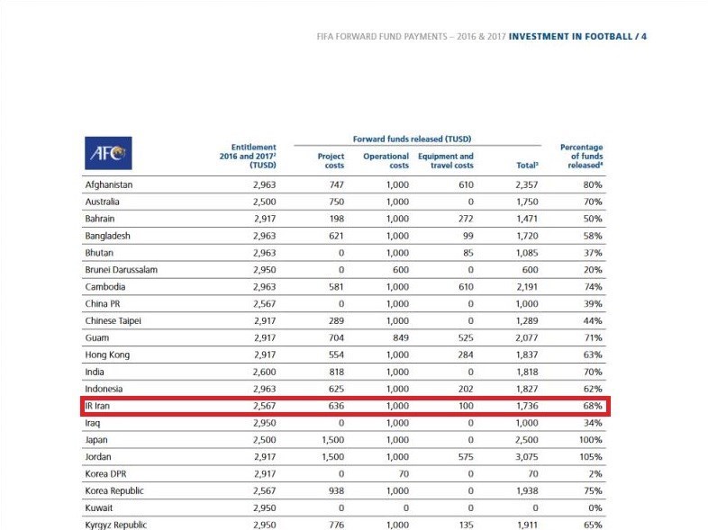 تمام این مبالغ را کنار کمک 2 میلیون و 567 هزار دلاری فیفا بگذارید که مربوط به سالهای 2017 و 2016 است. فیفا ریز کمکهای سالانه خود به تمام فدراسیونها را به صورت شفاف منتشر کرده که سهم فوتبال ایران مبلغ 2 میلیون و 567 هزار دلار است. از این مبلغ فدراسیون فوتبال یک میلیون و 736 هزار دلار آن را هزینه کرده که طبق جدول حدود 68 درصد میشود. این کمک برای سال 2018 نیز چیزی حدود 1.5 میلیون دلار است که فیفا اسناد این کمکها را هنوز منتشر نکرده است. این هزینهها مشمول اقدامات فدراسیونهای عضو فیفا در بخش توسعه فوتبال از جمله زیربنایی، فوتبال پایه، لجستیکی و... است. به این ترتیب فدراسیون نمیتواند مدعی شود که پاداش جام جهانی را برای توسعه فوتبال، زمین چمن کمپ یا اقدامات زیربنایی دیگر کرده، چون فیفا بودجه مشخصی برای این اقدامات در نظر گرفته و فدراسیون هم تنها 68 درصد آن را هزینه کرده است. (در تصویر زیر میزان کمک فیفا به فدراسیون فوتبال ایران در سال 2017 و 2016 با خط قرمز مشخص شده است.)