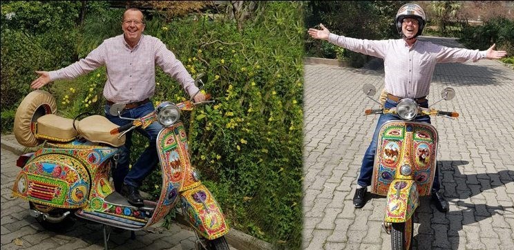 سفیر آلمان در پاکستان که مدتی است با فعالیت‌های عمومی خود محبوبیت بسیاری به دست آورده است این بار از موتور وسپای جدید خود رونمایی کرد.