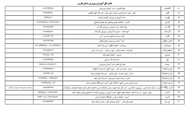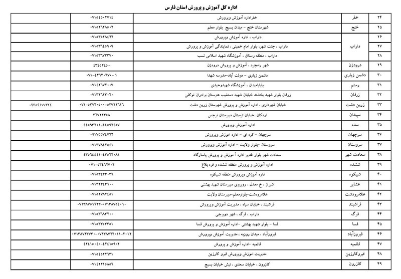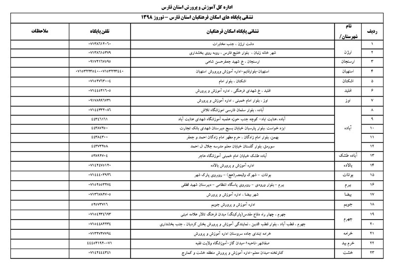 نشانی پایگاههای اسکان آموزش و پرورش فارس
