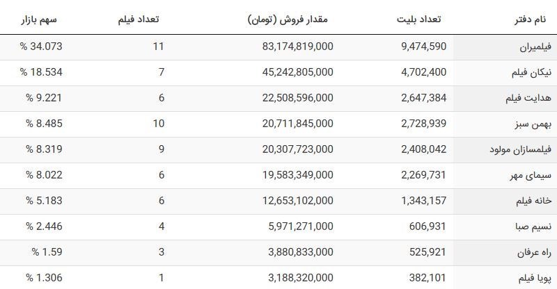 اما در معرفی 10 دفتر پخش موفق امسال رتبه اول را فیلمیران دارد که توانست 34 درصد بازار عرضه فیلم در دست داشته باشد. فیلمیران با توزیع 11 فیلم در سال جاری توانست 9,474,590 بلیط بفروشد و در آمدی بالغ بر 83 میلیارد و 174 میلیون تومان کسب کند.