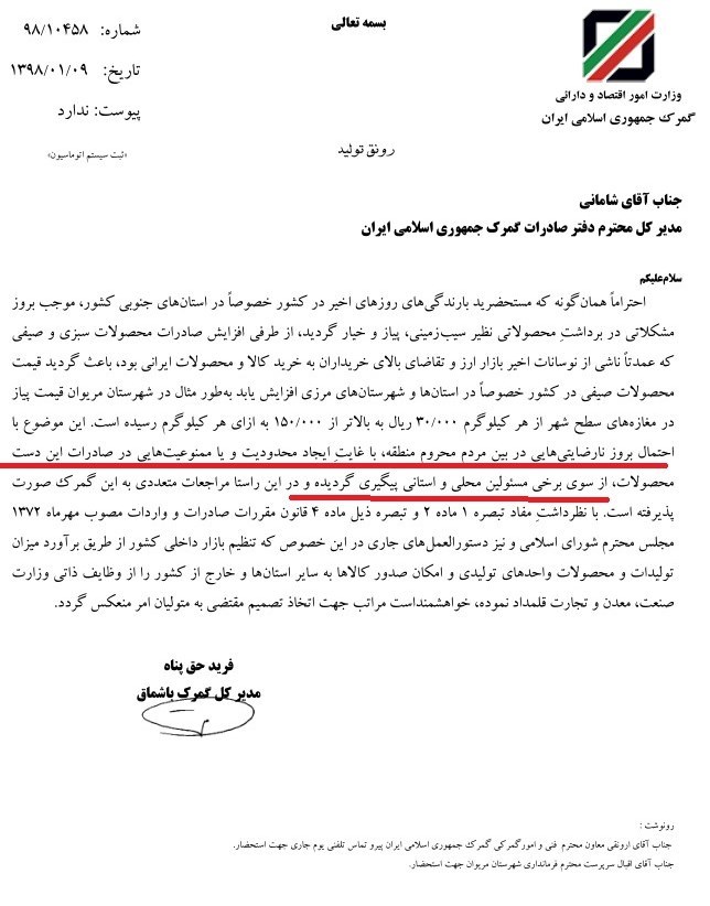 در این مکاتبه آمده است، موضوع (مورد اشاره) با احتمال بروز نارضایتی در بین مردم محروم منطقه، با هدف ایجاد محدودیت و یا ممنوعیت در صادرات این دست محصولات از سوی برخی مقامات محلی و استانی پیگیری گردید و در این راستا مراجعات متعددی به این گمرک صورت گرفته است.