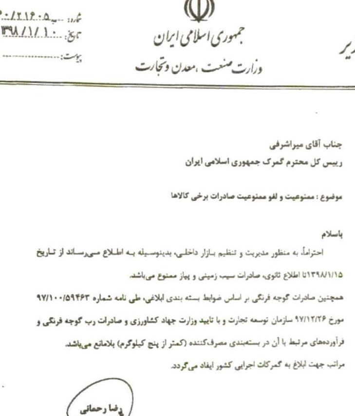 در ادامه و در روز 10 فرودین ماه وزیر صنعت، در مکاتبهای با رئیس کل گمرک ایران از ممنوعیت صادرات پیاز و سیب زمینی از روز 15 فروردین ماه خبر میدهد.