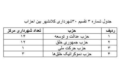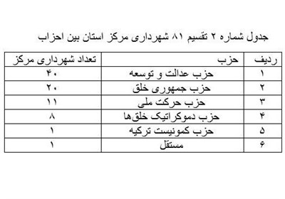 توضیح: هیچکدام از احزاب خوب٬ سعادت٬ وطن و دیگر احزاب کوچک نتوانستهاند صاحب یکی از 81 شهرداری مرکز استان شوند.