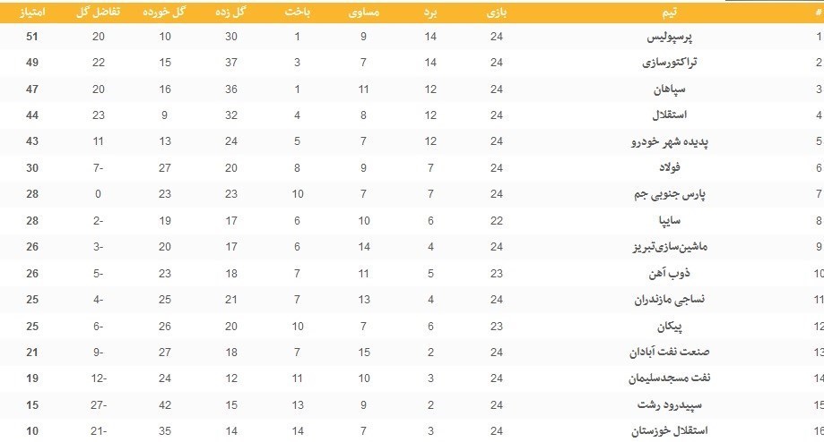 جدول ردهبندی رقابتهای لیگ برتر در پایان هفته بیست و چهارم: