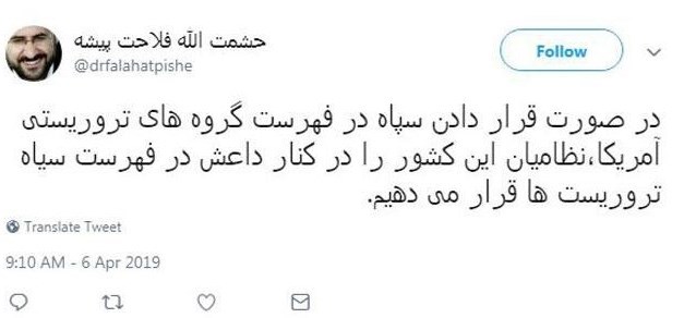 به گزارش گروه پارلمانی خبرگزاری تسنیم، حشمت الله فلاحتپیشه، رئیس کمیسیون امنیتملی و سیاستخارجی مجلس شورای اسلامی، در صفحه شخصی خود در توئیتر به احتمال قرار گرفتن نام سپاه در فهرست گروههای تروریستی توسط آمریکا واکنش نشان داد و نوشت: «در صورت قرار دادن سپاه در فهرست گروههای تروریستی آمریکا، نظامیان این کشور را در کنار داعش در فهرست سیاه تروریستها قرار میدهیم».