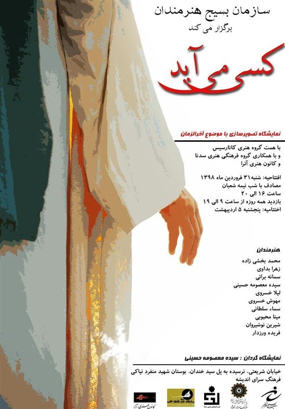 به گزارش باشگاه خبرنگاران پویا سازمان بسیج هنرمندان کشور با همکاری گروه هنری "کاتارسیس" و گروه فرهنگی هنری "سِدنا" اقدام به برگزاری نمایشگاه تصویرسازی با عنوان «کسی میآید» میکند.