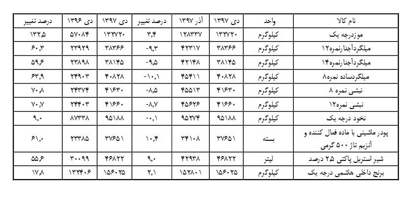 جزئیات تغییرات قیمتی انواع کالاهای اساسی در دی ماه 97 بهشرح زیر است: