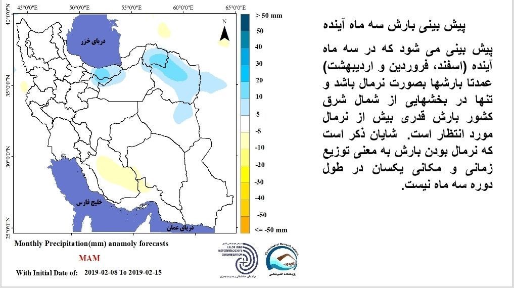 یکی از مهمترین بخشهای جلسه، پیش بینی سازمان هواشناسی بود که در جلسه 29 بهمن 97 شورای عالی آب توسط نماینده این سازمان ارایه شد. در این پیش بینی، اشاره شده که در سه ماهه اسفند، فروردین و اردیبهشت بارشها عمدتا نرمال و تنها در بخشهای از شمال شرق بارش قدری بیش از نرمال است.