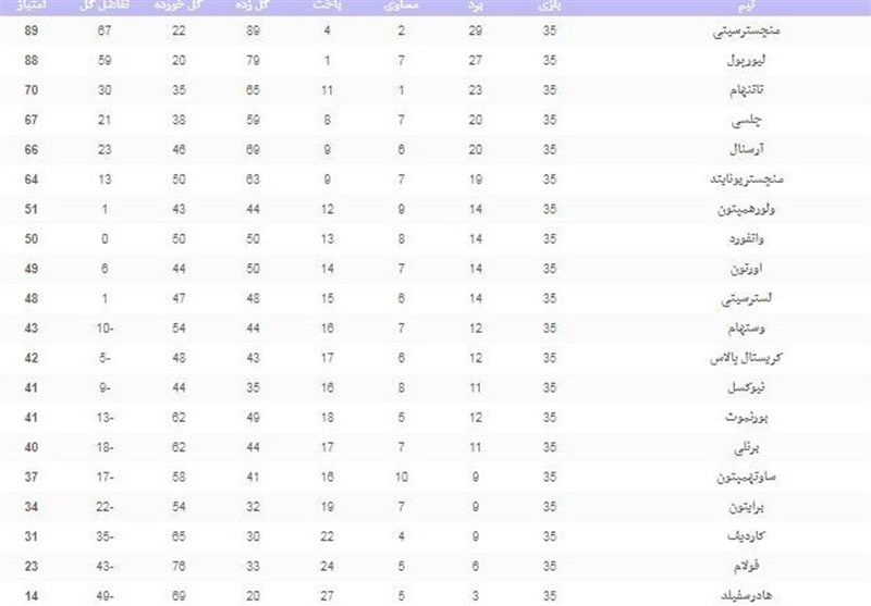 جدول ردهبندی لیگ برتر انگلیس را در زیر مشاهده کنید.