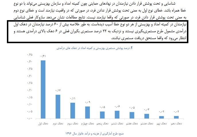 نتایج مطالعات نشان می‌دهد، سازوکار شناسایی نیازمندان در کمیته امداد و بهزیستی از هر دو نوع خطا آسیب دیده است. بیش از 60 درصدی نیازمندان در دهک اول درآمدی مشمول طرح مستمری بگیری نیستند. به عبارت دیگر در دهک اول تنها 40 دصد افراد تحت پوشش مستمری بهزیستی و کمیته امداد قرار دارند.