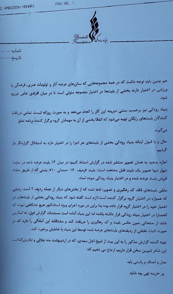 لازم است گفته شود که بنیاد رودکی بخشی از بلیتهای در اختیار خود را در اختیار گروه قرار داده بود؛