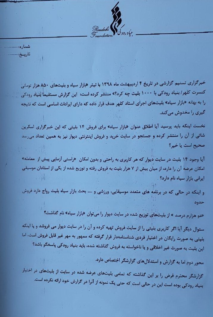 گزارشگر محترم فرض را بر این گذاشته که تمامی بلیتهای عرضه شده در سایت از بلیتهای در اختیار بنیاد رودکی بوده است این در حالی است که حتی یک نمونه از آنرا در گزارش خود ارائه نکرده است.