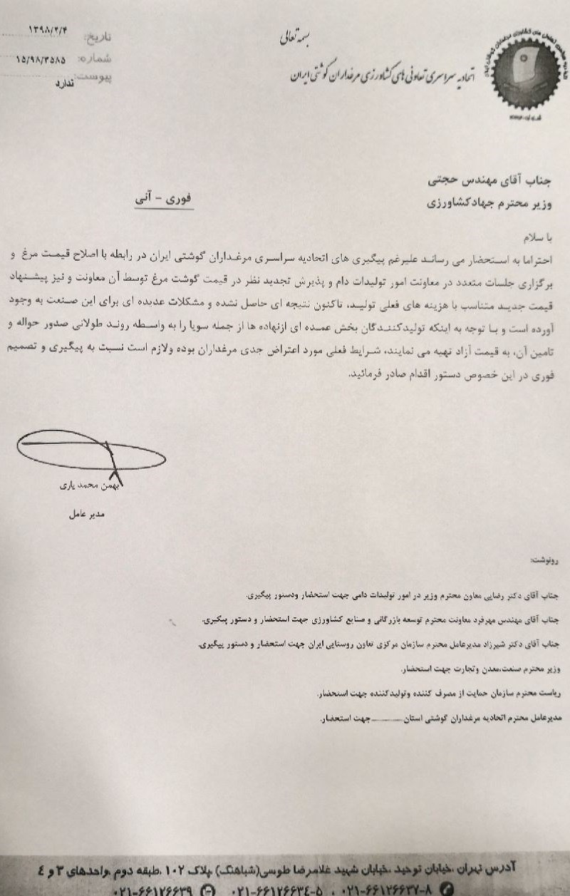 بر این اساس، بهمن محمدیاری مدیر عامل اتحادیه سراسری کشاورزی مرغداران گوشتی ایران با ارسال نامهای به محمود حجتی وزیر جهاد کشاورزی نوشت: احتراماً به استحضار میرساند علیرغم پیگیریهای اتحادیه سراسری مرغداران گوشتی ایران در رابطه با اصلاح قیمت مرغ و برگزاری جلسات متعدد در معاونت امور تولیدات دام و پذیرش تجدیدنظر در قیمت گوشت مرغ توسط آن معاونت و نیز پیشنهاد قیمت جدید متناسب با هزینههای فعلی تولید، تاکنون نتیجهای حاصل نشده و مشکلات عدیدهای برای این صنعت به وجود آورده است.