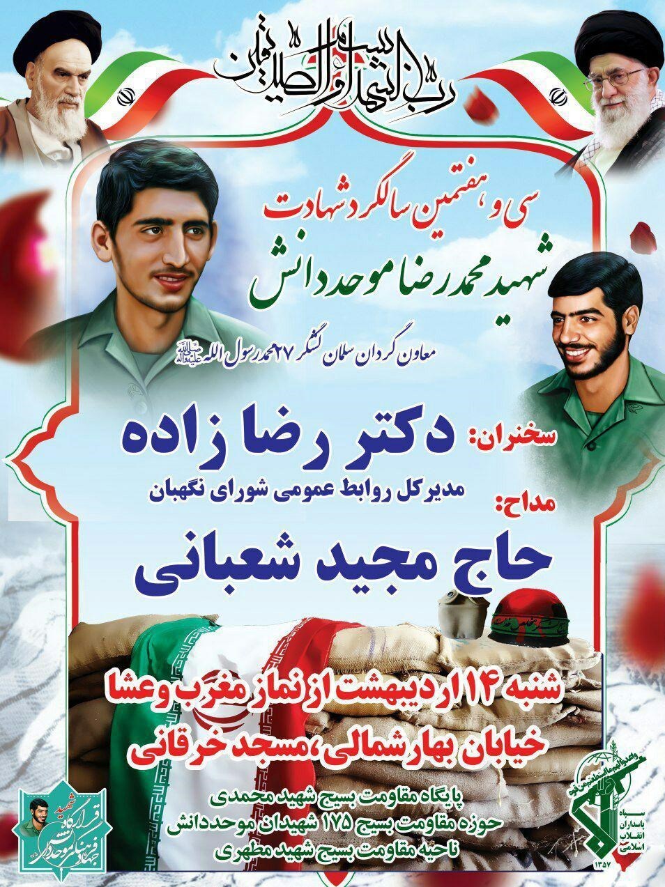 همچنین هیئت رزمندگان اسلام با همکاری قرارگاه جهاد فرهنگی شهید موحددانش، به مناسبت سیوهفتمین سالگرد شهادت شهید محمدرضا موحددانش معاون گردان سلمان لشکر 27 محمد رسولالله (ص) برنامهای را تدارک دیده است.