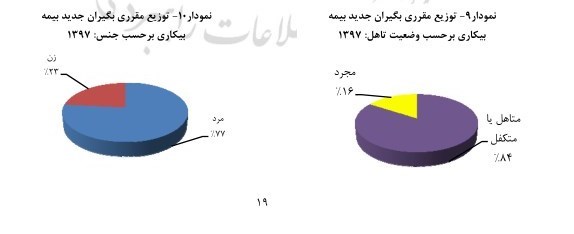 بررسی تعداد مقرری بگیران جدید بیمه بیکاری بر حسب جنس نشان می دهد که در سال 1397 مردان 77درصد از مقرری بگیران جدید را به خود اختصاص داده اند. همچنین از بین تمام مقرری بگیران جدید بیمه بیکاری 1397 حدود 84 درصد متاهل یا متکفل می باشد.