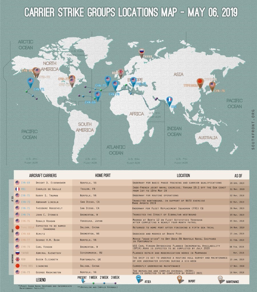 موقعیت ناوهای هواپیمابر آمریکایی، روسی، فرانسوی، انگلیسی و چینی؛ ناو هواپیمابر آبراهام لینکن تا دو روز پیش در دریای مدیترانه بوده است