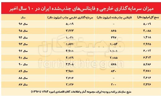 یکی دیگر از دستاوردهای مورد انتظار برجام، افزایش سرمایه‌گذاری خارجی است. در این زمینه نیز به‌رغم وعده جذب 30 میلیارد دلار سرمایه‌گذاری خارجی در دو سال اول پسابرجام، بررسی‌های آماری (جدیدترین آمار سازمان برنامه و بودجه) نشان می‌دهد مجموع سرمایه‌گذاری خارجی و فاینانس‌های جذب‌شده ایران از 2.3 میلیارد دلار در سال 1387 به 5.2 میلیارد دلار در سال 90، به 6.3 میلیارد دلار در سال 91 و به 6 میلیارد دلار در سال 1392 رسیده که این میزان طی سال‌های 93 و 94 به ترتیب به 2.9 و 1.5 میلیارد دلار کاهش پیدا کرده است. اما در پسابرجام دولت توانسته است در سال 95 حدود چهارمیلیارد دلار و در سال 96 نیز حدود پنج‌میلیارد دلار (دقیقا پنج‌میلیارد و 19 میلیون دلار) سرمایه‌گذاری خارجی و فاینانس جذب کند. بر این اساس وعده دولت و البته انتظارات پسابرجامی برای افزایش سرمایه‌گذاری خارجی نه‌تنها تحقق نیافته، بلکه میزان سرمایه‌گذاری خارجی در بهترین حالت خود طی سال‌های 95 و 96 کمتر از سال‌های 91 و 92 است که ایران تحت شدیدترین تحریم‌های آمریکا، اتحادیه اروپا و سازمان‌ملل بوده است.