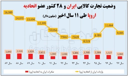 30 میلیون دلار رسید اما طی یک‌سال اخیر به‌رغم اینکه ایران از سوی اتحادیه اروپا و سازمان‌ملل تحریم نشده، صادرات کالایی ایران به 28 عضو اتحادیه در سال 97 با کاهش 30 درصد از 1.5 میلیارد دلار در سال 96 به یک‌میلیارد و 60 میلیون دلار رسیده است.