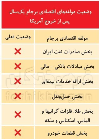 بررسی‌ها نشان می‌دهد در پسابرجام برخی تحریم‌های اعمال‌شده در سال‌های 2010 و 2012 و قبل از آن برداشته شده است که شامل: 1- پس از برجام نظام ممنوعیت و اخذ مجوز نقل و انتقال مالی از ایران، 2- تحریم‌های مربوط به فعالیت‌های بانکی شامل افتتاح شعب بانکی و همکاری‌های بین‌بانکی، 3- تحریم‌های بیمه، 4- ارائه خط اعتباری صادرات، ضمانتنامه و بیمه‌نامه به افرادی که قصد تجارت با ایران دارند، 5- تحریم‌های مربوط به کمک‌های بلاعوض، کمک‌های مالی و وام‌های ترجیحی، 6- تحریم‌های مربوط به انتشار اوراق قرضه تضمین‌شده توسط دولت ایران، 7- تحریم‌های مربوط به واردات نفت از ایران، 8- تحریم‌های مربوط به واردات فرآورده‌های پتروشیمی ایران، 9- تحریم‌های مربوط به سرمایه‌گذاری در بخش‌های نفت، گاز و پتروشیمی، 10- تحریم‌های مرتبط به کشتیرانی و کشتی‌سازی، 11- تحریم‌های مربوط به بخش حمل‌ونقل، 12- تحریم‌های مربوط به طلا، فلزات گرانبها و الماس، اسکناس و سکه، 13- تحریم سوئیفت و 14- گشایش اعتبارات اسنادی (ال‌سی‌ها) است. بر این اساس با تحریم‌هایی که آمریکا در مرداد و آبان سال 1397 اعمال کرد، به‌جز تحریم‌های مربوط به فرآورده‌های پتروشیمی، عملا همه موارد مذکور بازهم پس از خروج آمریکا از برجام تحریم شده‌اند و درنهایت نیز از نیمه دوم اردیبهشت سال جاری معافیت خرید نفت ایران به پایان رسید و حالا می‌توان گفت همه پازل‌های اقتصادی که دولت آنها را ماحصل برجام می‌دانست، از هم گسسته و شرایط به روزهای قبل از برجام برگشته است.