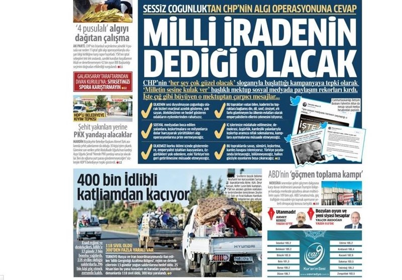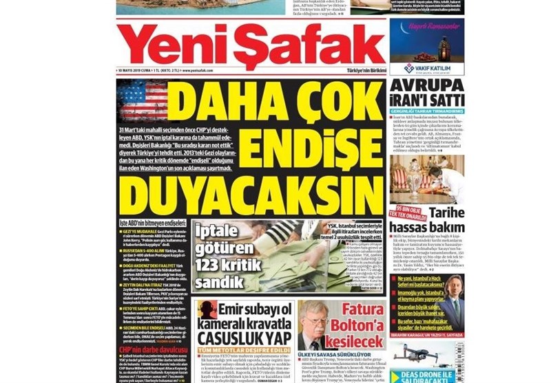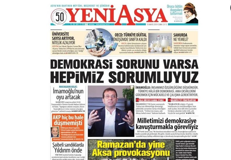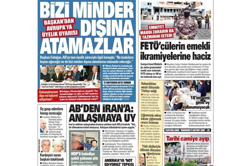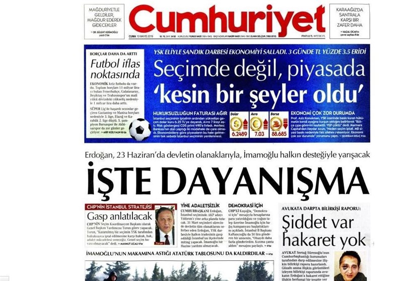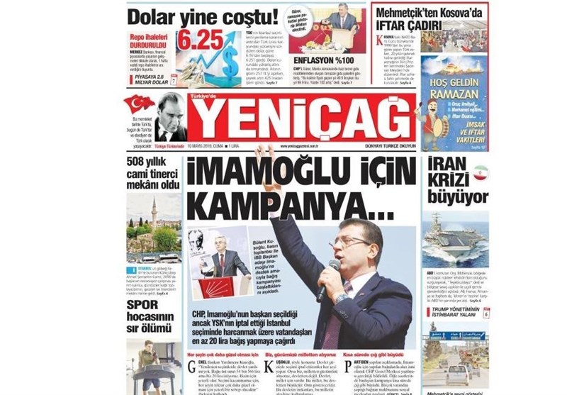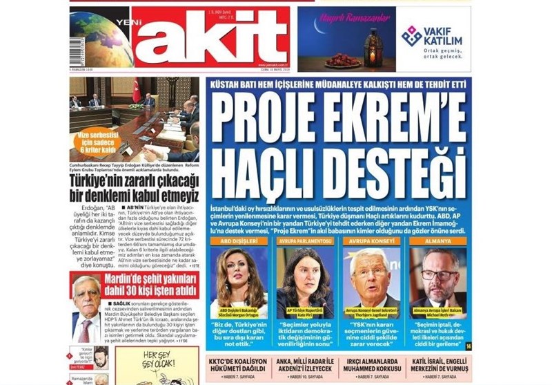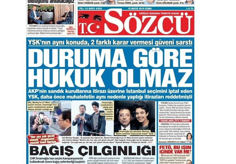 به گزارش گروه بین‌الملل خبرگزاری تسنیم، بسیاری از روزنامه‌های ترکیه، امروز در عکس و تیتر صفحه نخست، موضوع انتخابات استانبول را برجسته کرده‌اند. همچنین این روزنامه‌ها موضوعات دیگری مانند سخنان اردوغان در مورد عضویت ترکیه در اتحادیه اروپا را مورد توجه قرار داده‌اند.