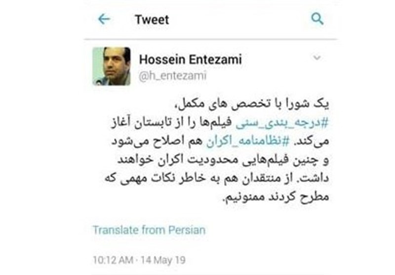 به گزارش خبرنگار فرهنگی خبرگزاری تسنیم، بعد از انتقاداتی که نسبت به رویه اکران فیلمهای سینمایی و مشکلاتی که برای برخی فیلمسازان و پخشکنندگان بهوجود میآورد حسین انتظامی رئیس سازمان سینمایی از اصلاح نظامنامه اکران خبر داد و نوشت: یک شورا با تخصصهای مکمل، درجهبندی سنی فیلمها را از تابستان آغاز میکند. نظامنامه اکران هم اصلاح میشود و چنین فیلمهایی محدودیت اکران خواهند داشت. از منتقدان هم به خاطر نکات مهمی که مطرح کردند ممنونیم.