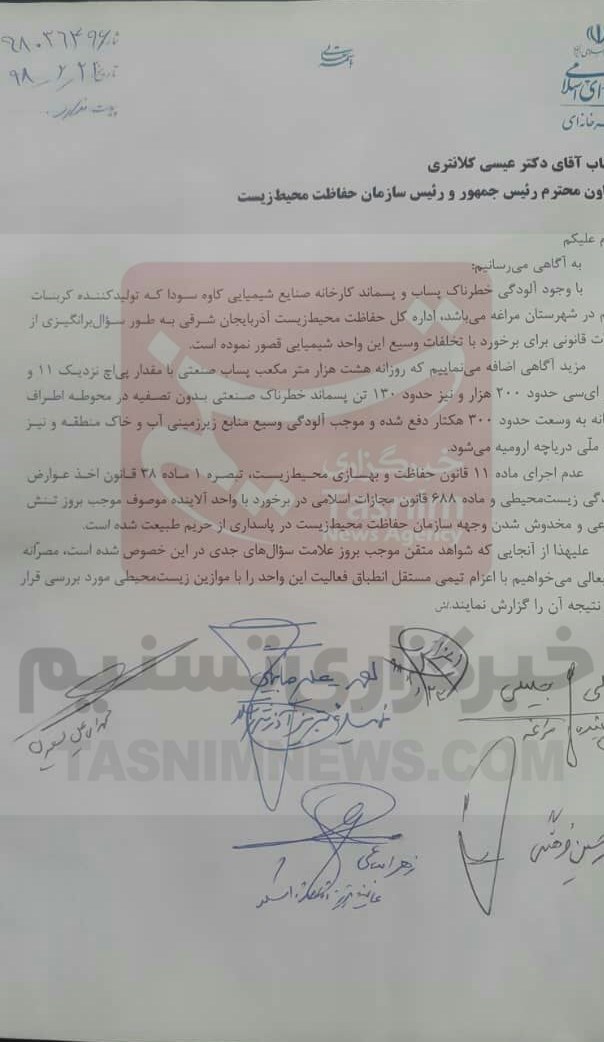 احتراما به آگاهی میرسانیم؛ با وجود آلودگی خطرناک پساب و پسماند کارخانه صنایع شیمیایی کاوه سودا که تولیدکننده کربنات سدیم در شهرستان مراغه میباشد، اداره کل حفاظت محیط زیست آذربایجان شرقی از اقدام قانونی برای برخورد با تخلفات وسیع این واحد شیمیایی قصور کرده است.