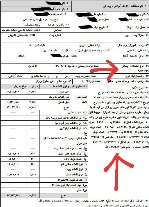 این تصویر، حکم یکی از معلمان جدیدالورود است که نوع استخدام او را "پیمانی" تعیین کرده است.