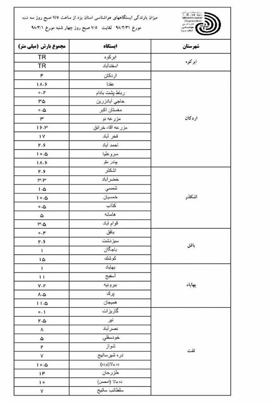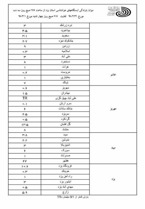 جداول زیر میزان بارندگی 24 ساعت گذشته در شهرستانهای مختلف استان یزد را نشان میدهد.