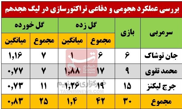 با توجه به این جدول، بهترین عملکرد تراکتورسازی در خط تهاجمی، مربوط به دوره هدایت محمد تقوی است. سرخپوشان با تقوی 17 گل به ثمر رسانده و میانگین 1.88 گل در هر بازی را در 9 بازی رقم زدهاند. نکته قابل توجه در این میان، برابری میانگین امتیازات کسب شده و گل زده در هر بازی برای تراکتورسازی در دوره حضور تقوی است.