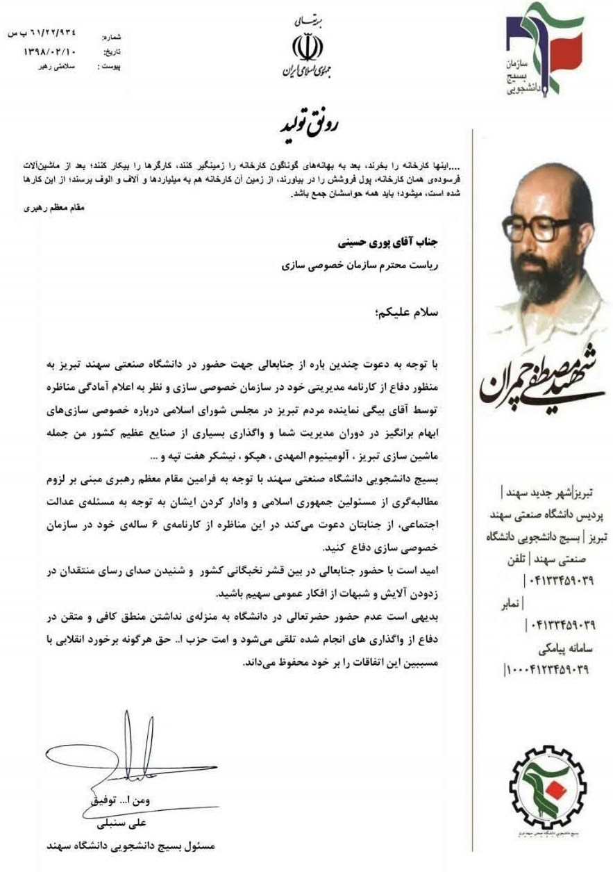 وی ادامه داد: ما نیز بعد از این نتایج، نامه‌ای به ریاست سازمان خصوصی سازی کشور ارسال کرده و در آن به غیر عادی بودن روند خصوصی‌سازی اشاره و رسیدگی ایشان را خواستار شدیم که به طرز متکبرانه‌ای با این تلنگر برخورد شد، البته شبیه این نامه را به دکتر پزشکیان، حجت‌الاسلام آل هاشم و دادستان تبریز نیز ارسال کردیم.