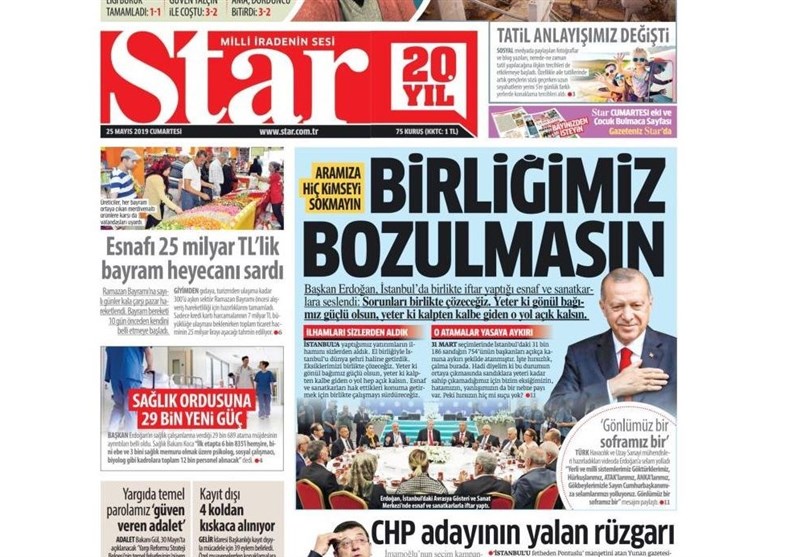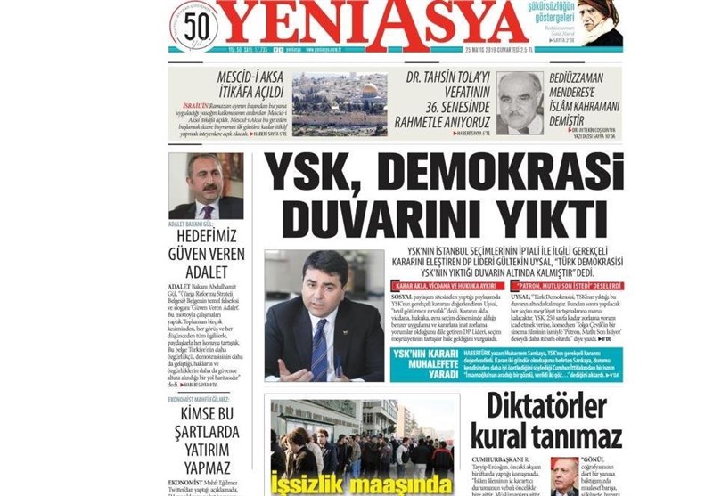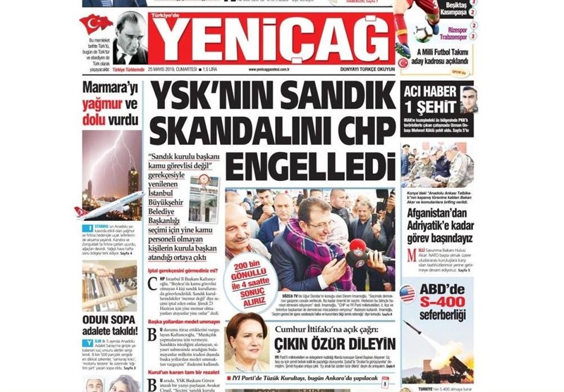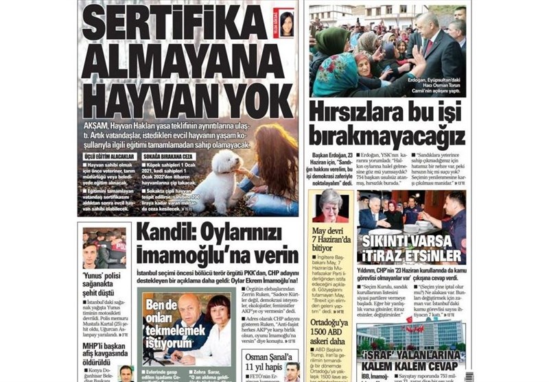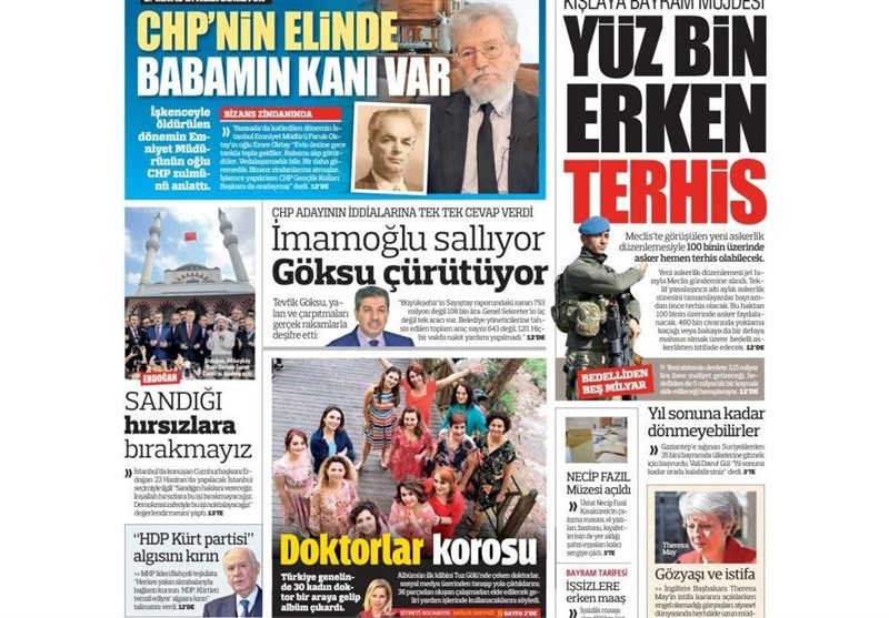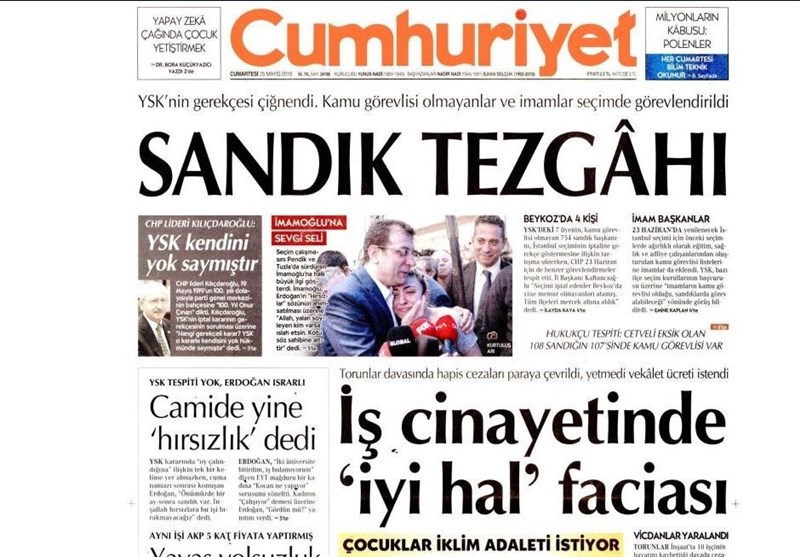 به گزارش گروه بینالملل خبرگزرای تسنیم، بسیاری از روزنامههای ترکیه، امروز در عکس و تیتر صفحه نخست، اظهارات اردوغان در مورد انتخابات استانبول را برجسته کردهاند. این روزنامهها همچنین کنارهگیری ترزا می نخست وزیر انگلیس را نیز مورد توجه قرار دادهاند.